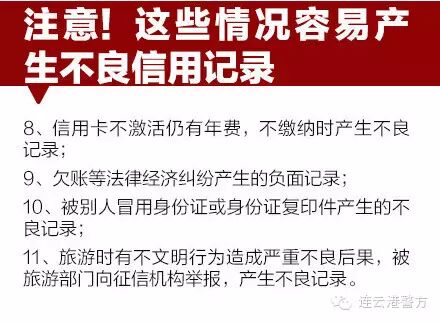 个人信用出现不良记录,可能影响信用卡办理、买房贷款…手机号停用不办手续、信用卡不激活、水电燃气费不按时交,旅游时有不文明行为且造成严重不良后果,都可能产生不良记录。个人信用记录维护全攻略↓收藏学习!