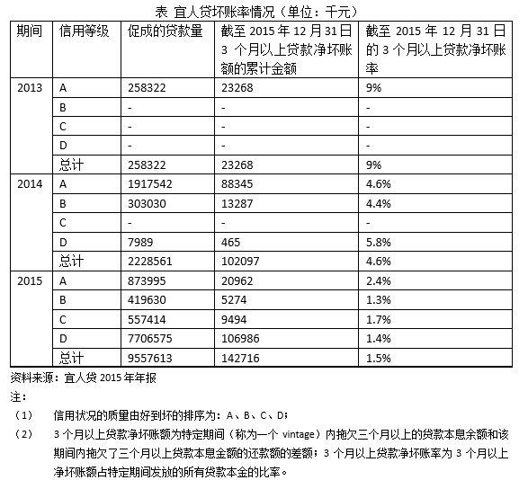 从上图可以看出,2013年宜人贷只发放了A类贷款,3个月以上贷款净坏账率(以下简称坏账率)为9%。2014年,A类贷款的坏账率骤降至4.6%,这一数字在2015年又降至2.4%。2015年,B类贷款的坏账率从2014年的4.4%降低到了1.3%,而信用状况最差的D类贷款的坏账率为2014年5.8%降低到了1.4%。