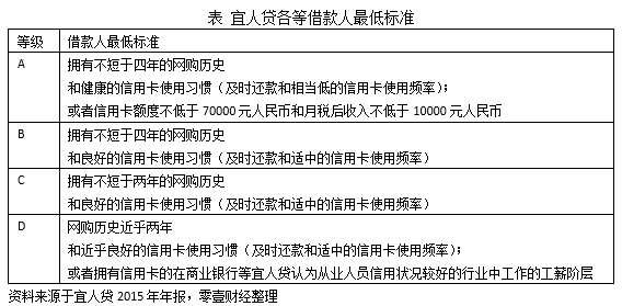 宜人贷将贷款按照借款人信用风险的大小依次分为A、B、C、D四种等级,还设定了各等级的最低标准(详见下表)。