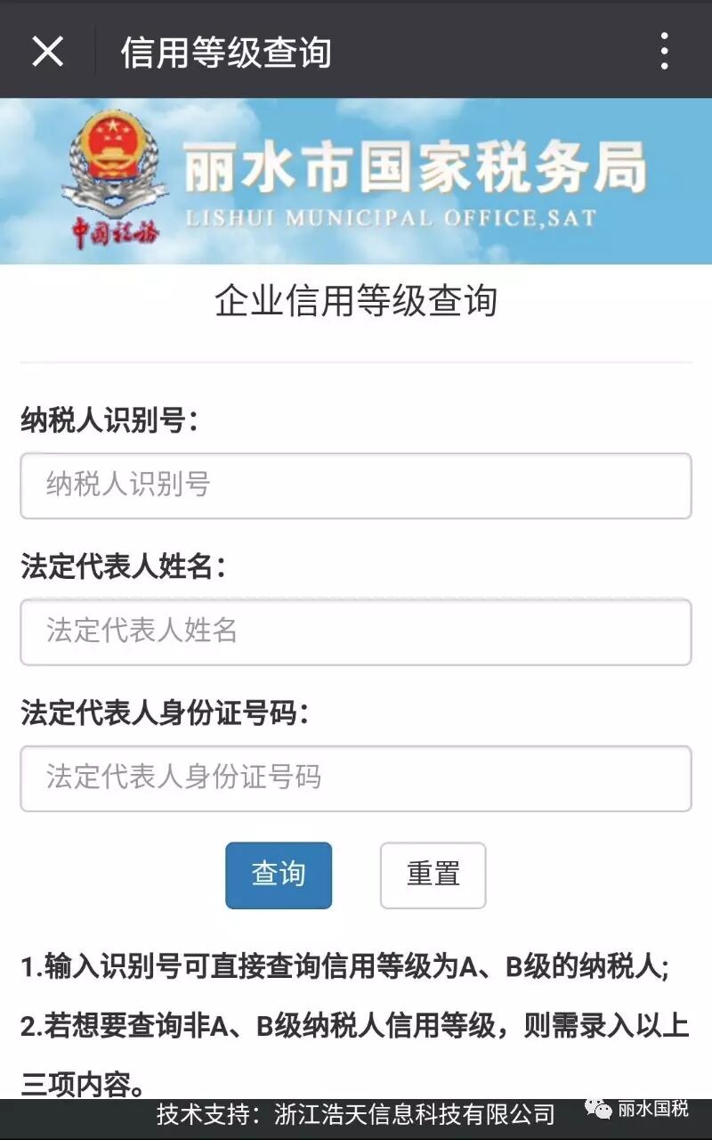 关注“丽水国税”微信公众号,点击下方“微查询”模块中“信用等级”子栏目,输入纳税人识别号、法人姓名、身份证号,您就可以查询到您企业的纳税信用等级啦,是不是很方便呢。