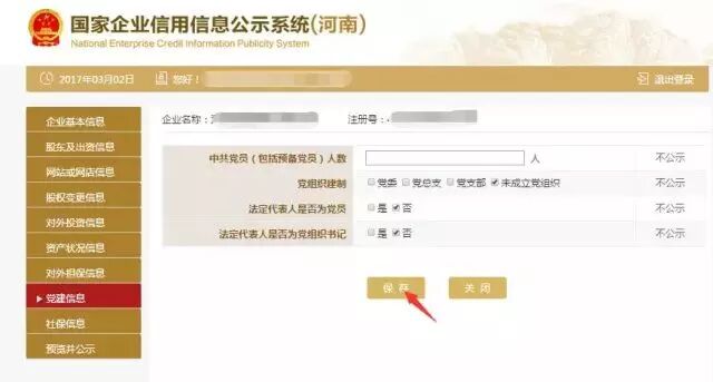 第十二步:填写党建信息。党建信息为不公示信息,主要采集企业党组织的建立情况,但属于抽查范围,请注意如实填写。其中,中共党员(包括预备党员)人数,为截至年度报告年份12月31日的人数。