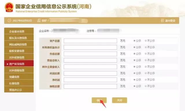 第十步:填写资产状况信息。点击左边“资产状况信息”填写后保存。企业资产状况信息,应当是企业年度资产负债表和损益表(利润表)中的期末数;纳税总额为企业全年实缴各类税金的总和。