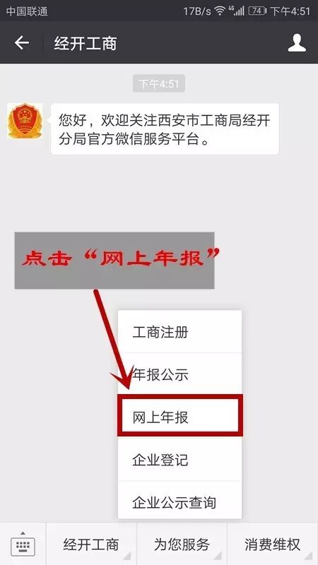 在“经开工商”微信平台下方菜单中,选择“为你服务”,点击“网上年报”