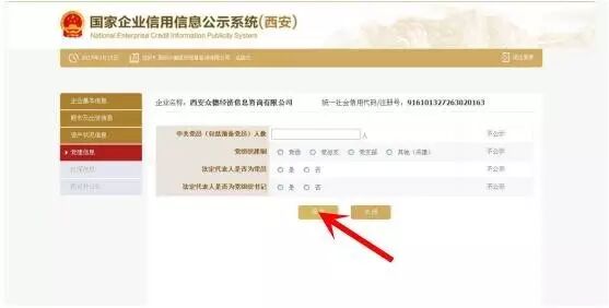 第十一步:填写党建信息。党建信息为不公示信息,主要采集企业党组织的建立情况,但属于抽查范围,请注意如实填写。其中,中共党员(包括预备党员)人数,为截至年度报告年份12月31日的人数。