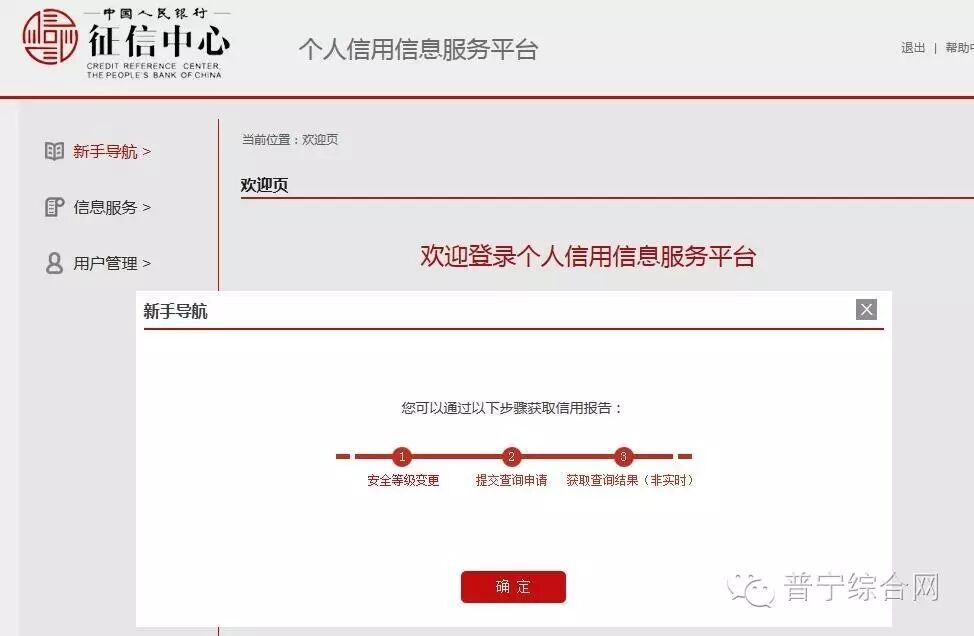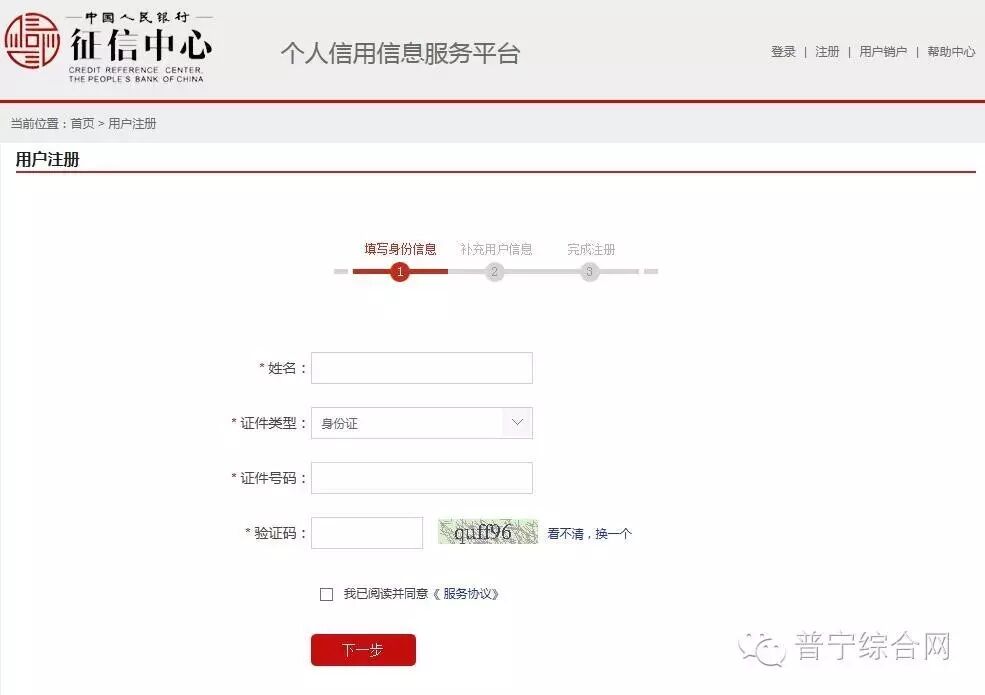 打开中国人民银行征信中心个人信用信息服务平台的官方网站 https://ipcrs.pbccrc.org.cn点击用户注册,填写以下三个步骤信息完成注册