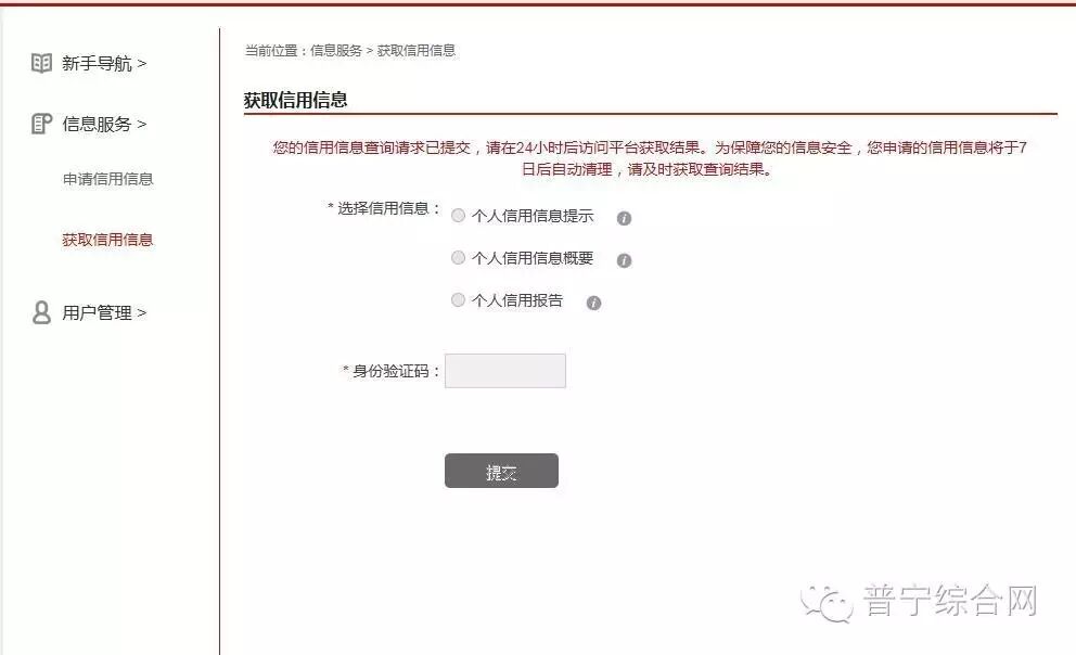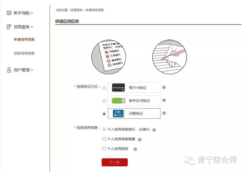 2.根据个人验证方式,选择查询相关信用信息,提交查询申请