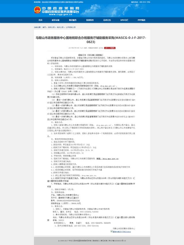 7月19日,受安徽省马鞍山市国家税务局、安徽省马鞍山市地方税务局的委托,马鞍山市政府集中采购中心就“马鞍山市政务服务中心国地税联合办税服务厅辅助服务采购”项目进行公开招标,并发布了《招标公告》。