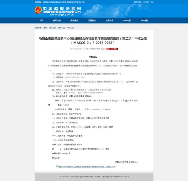 开标日当天,马鞍山市政府集中采购中心发布的《中标公告》显示:中标人为安徽航天信息有限公司。