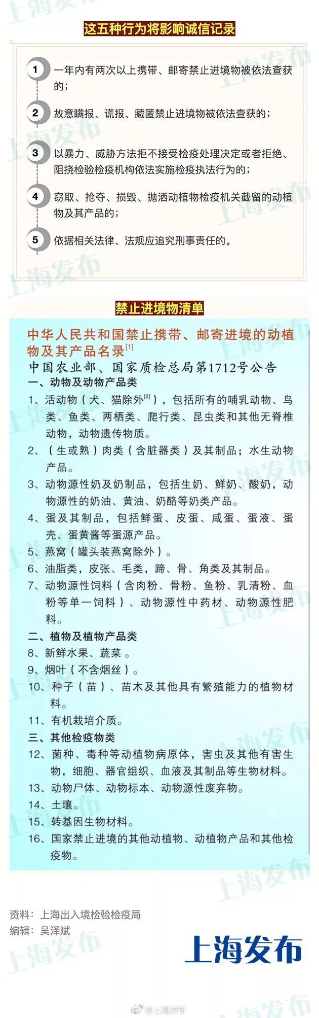 上海出入境检验检疫局说,将于2018年1月1日施行的《上海口岸旅邮检信用信息归集和使用管理办法(试行)》明确,出入境旅客或进出境邮寄物的寄递人发生以下违反检验检疫法律法规的行为的,将作为个人失信信用信息被记录,检验检疫机构将严格按规定向国家和上海市公共信用信息服务平台提供信用信息。
