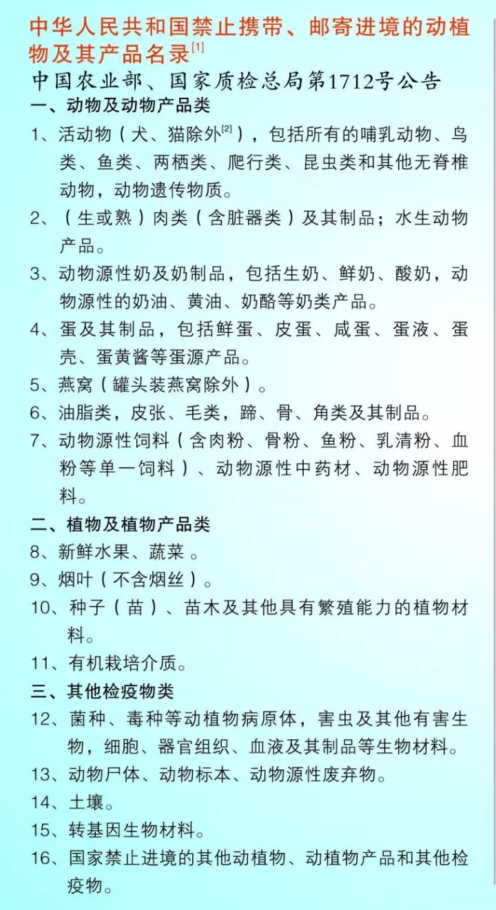 注:1.通过携带或邮寄方式进境的动植物及其产品和其他检疫物,经国家有关行政主管部门审批许可,并具有输出国家或地区官方机构出具的检疫证书,不受此名录的限制。2.具有输出国家或地区官方机构出具的动物检疫证书和疫苗接种证书的犬、猫等宠物,每人仅限一只。