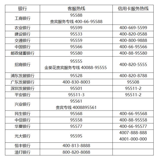 附:全国性银行客服热线及信用卡服务热线