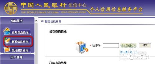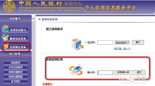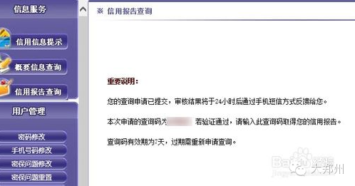 然后点击左侧的 信用报告查询, 输入手机短信中的确认码,然后点击提交 就会显示个人信用的查询结果了.