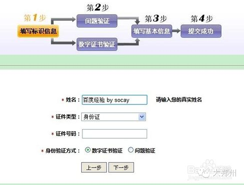 填写个人真实姓名和身份证号码等资料,验证方式有2种,建议选择问题验证,接下来进入下一步设置问题验证内容.最后提交就可以了