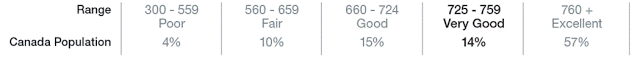 这个信用分数在300分至900分之间(725分以上算是好,800分以上算是非常好)。此分数是根据整个信用市场的变化随时调整的,主要是提供一个你在整个加拿大人口里面信用分数高低的范围,主要看你是在哪一个分数段。各个财务机构都是用这个分数来审核你的贷款或者信用卡申请,然后再根据他们自己的标准来决定是不是借钱给你。
