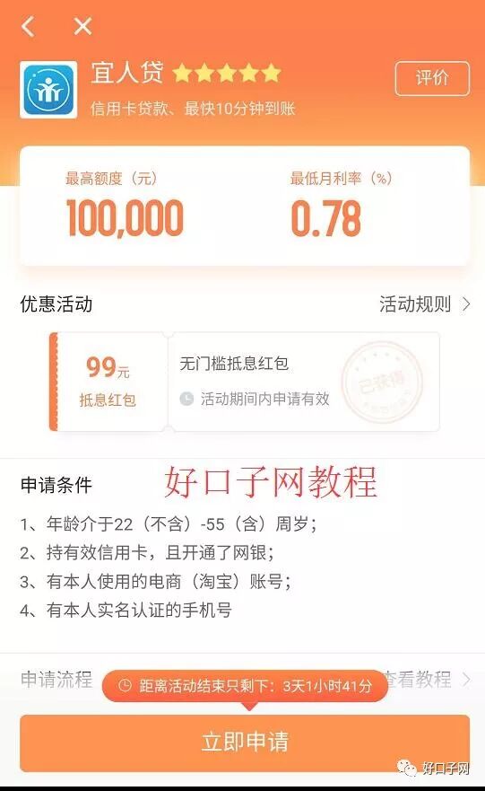 申请条件:22-55周岁,持有效信用卡使用一年以上,并且开通网银,有实名制手机号及常用淘宝账号