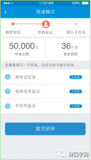 5、接着得出预审批额度,确认申请额度信息之后,提交进入完善资料页面