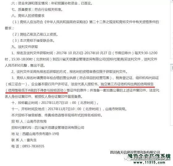 《公告》要求,竞标人报名时除了携带“年检合格的营业执照(符合项目的经营范围)”、“税务登记证”等证件外,还需要提供“独立第三方征信机构出具的信用报告(信用等级低于A级的不得参与投标活动)”。