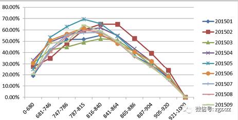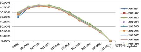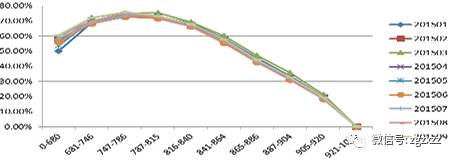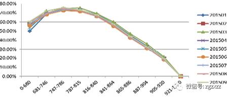 “数字解读”产品在我行信用卡和信贷审批业务中应用广泛。在消费信贷授信流程中,结合数字解读,可以通过风险系数调整对优质客户授信额度。在信用卡业务方面,我行在信用卡分期政策上结合”数字解读”进行信用分群,在此基础上更有针对性地对客户进行营销。2016年4月上线至2016年10月共计带来了3.65亿的信用卡分期规模。图1是“数字解读”产品在我行信用卡贷前阶段的表现,可以看出该产品在我行信用卡贷前的风险排序上基本稳定,而且排序单调性较好。图2显示该产品在贷前的区分能力较强,最高的柯尔莫格洛夫 - 斯米尔诺夫指标大于50%。贷后管理