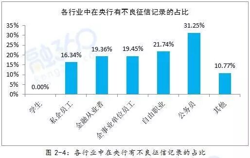 接受调查的公务员中,31.25%在央行的个人征信中有不良记录,这一比例在所调查的人群中最高,金融从业者中这一比例为19.36%。