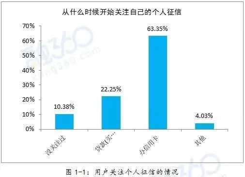 接受调查的用户中,有10.38%表示没有关注过自己的个人征信,63.35%用户由于办信用卡才关注个人征信,另有22.25%用户是由于贷款才开始关注。