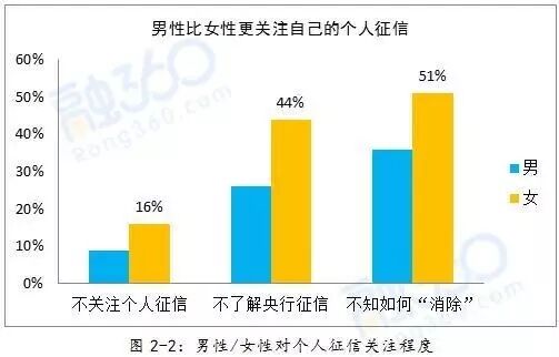 接受调查的男性用户中,有9%不关注自己的个人征信,女性这一比例高达16%。对于央行的个人征信情况,26.22%男性表示不了解,而女性的这一比例高达44%。36%的男性用户不知道如何“消除”央行的不良征信记录,女性却高达51%。